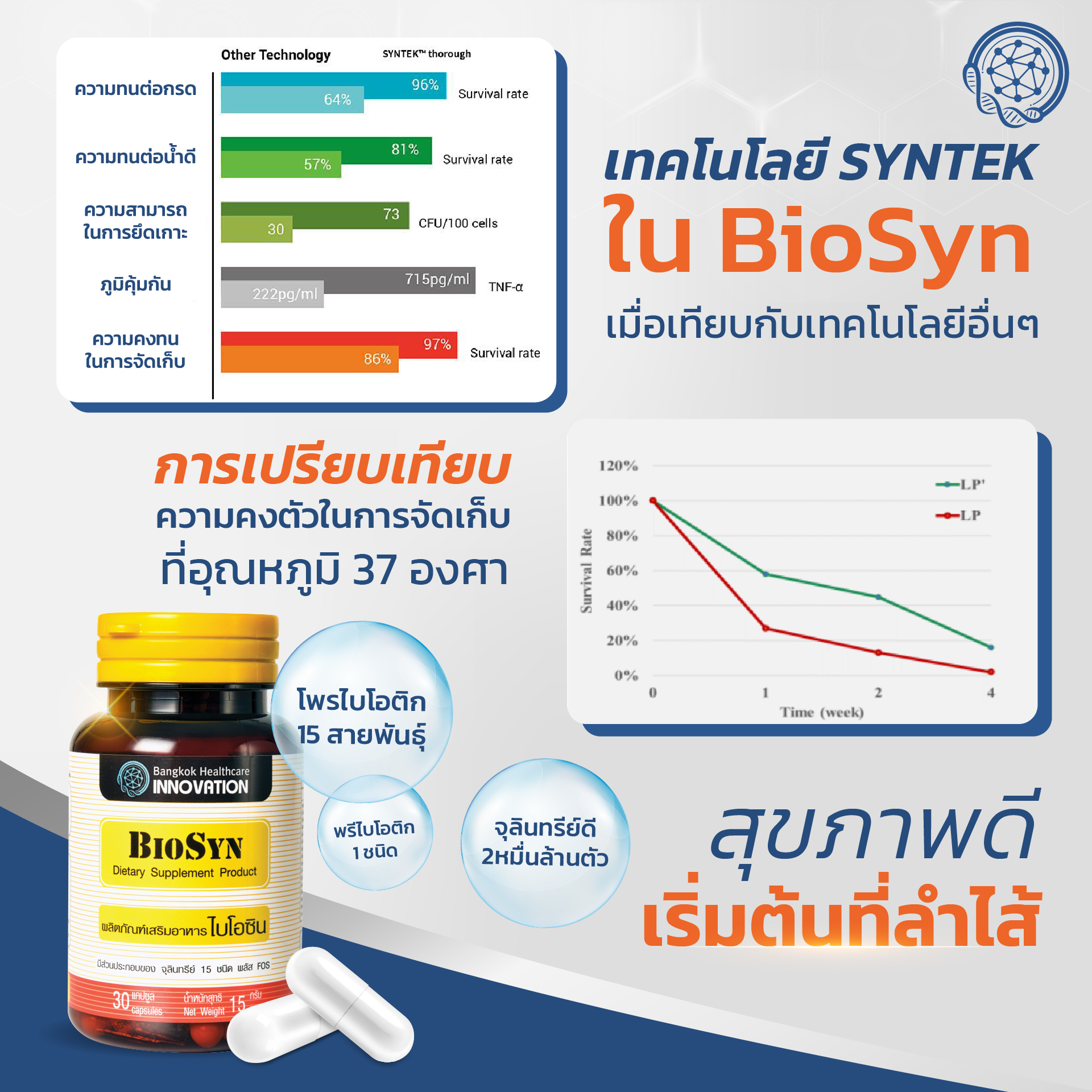 BioSyn เป็น Synbiotic ปรับสมดุลลำไส้ ผลิตภายใต้นวัตกรรม SYNTEK™ ซึ่งเป็นนวัตกรรมที่ใช้ในทางการเเพทย์ เเละเป็นสาขานวัตกรรมการผลิตโพรไบโอติก 1 ใน 4 ของโลก โดยนวัตกรรม SYNTEK™ นี้เเบ่งเป็น 3 ขั้นตอนการผลิตค่ะ