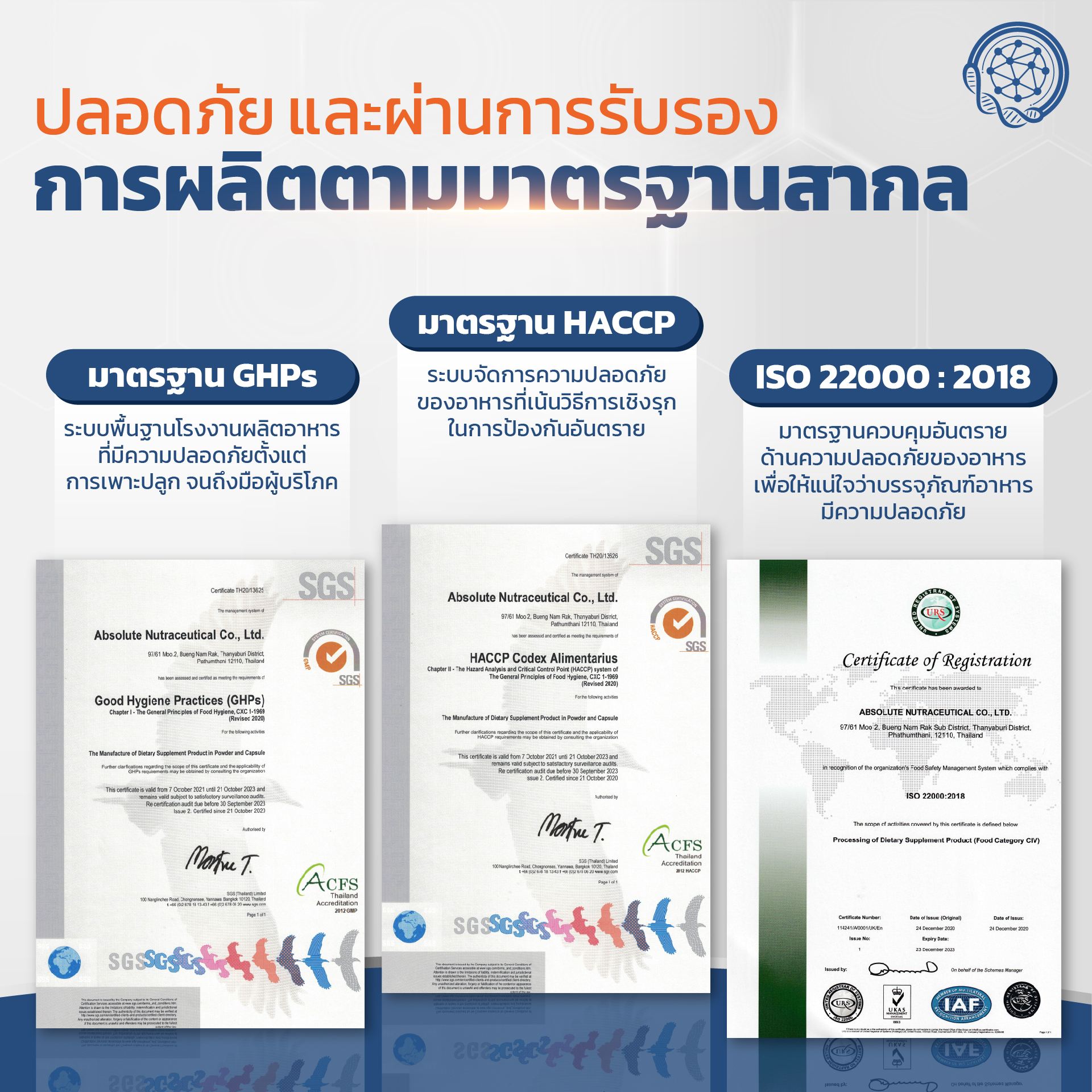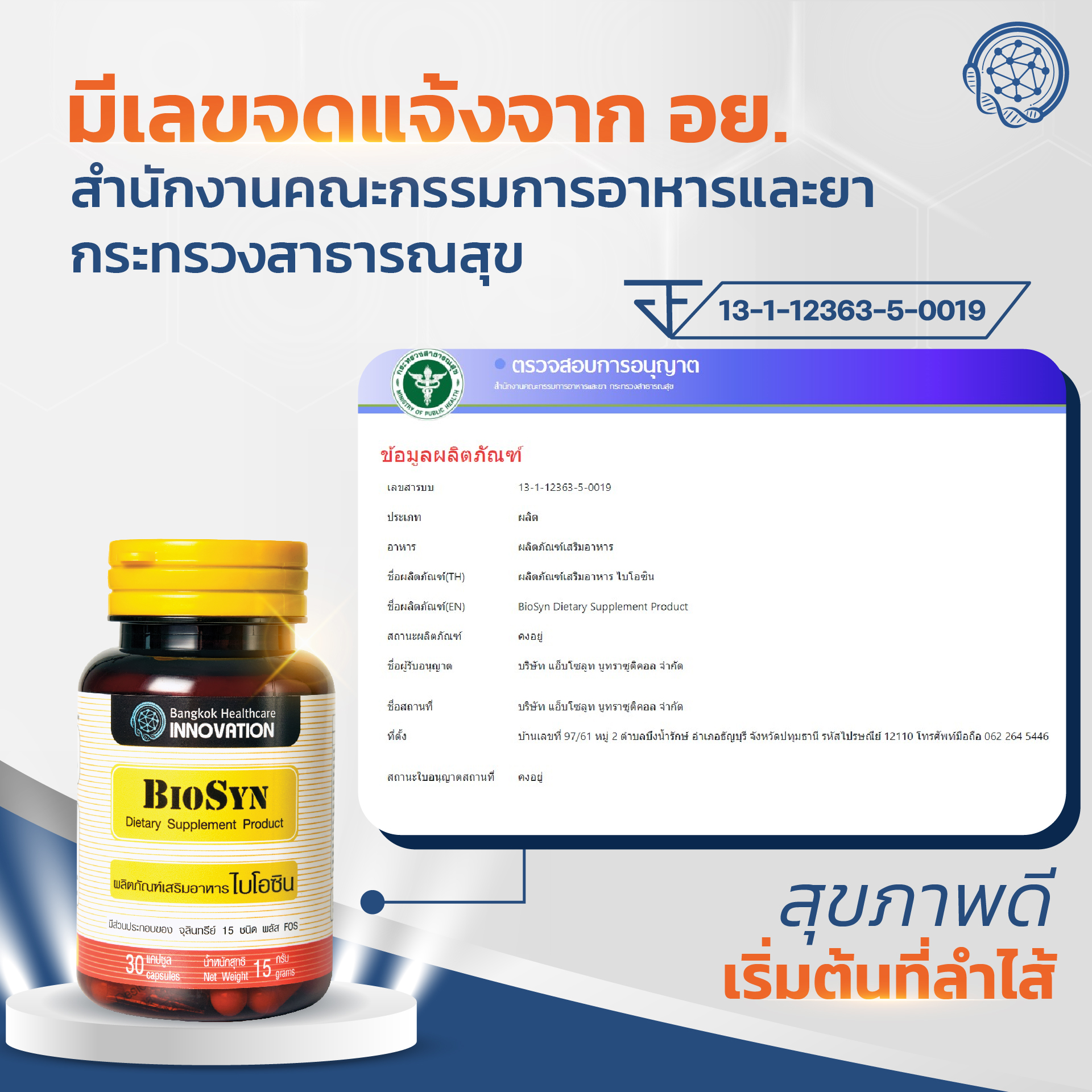 ผลิตภัณฑ์ BioSyn ได้ผ่านการรับรองการผลิตตามมาตรฐานสากล และมีเลขจดแจ้งจากสำนักงานคณะกรรมการอาหารเเละยากระทรวงสาธารณสุข เลือกทานโพรไบโอติกที่ได้มาตรฐานเเละปลอดภัย เลือก BioSyn ซินไบโอติกสมดุลลำไส้ ได้นะคะ