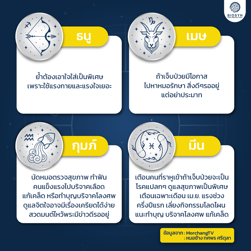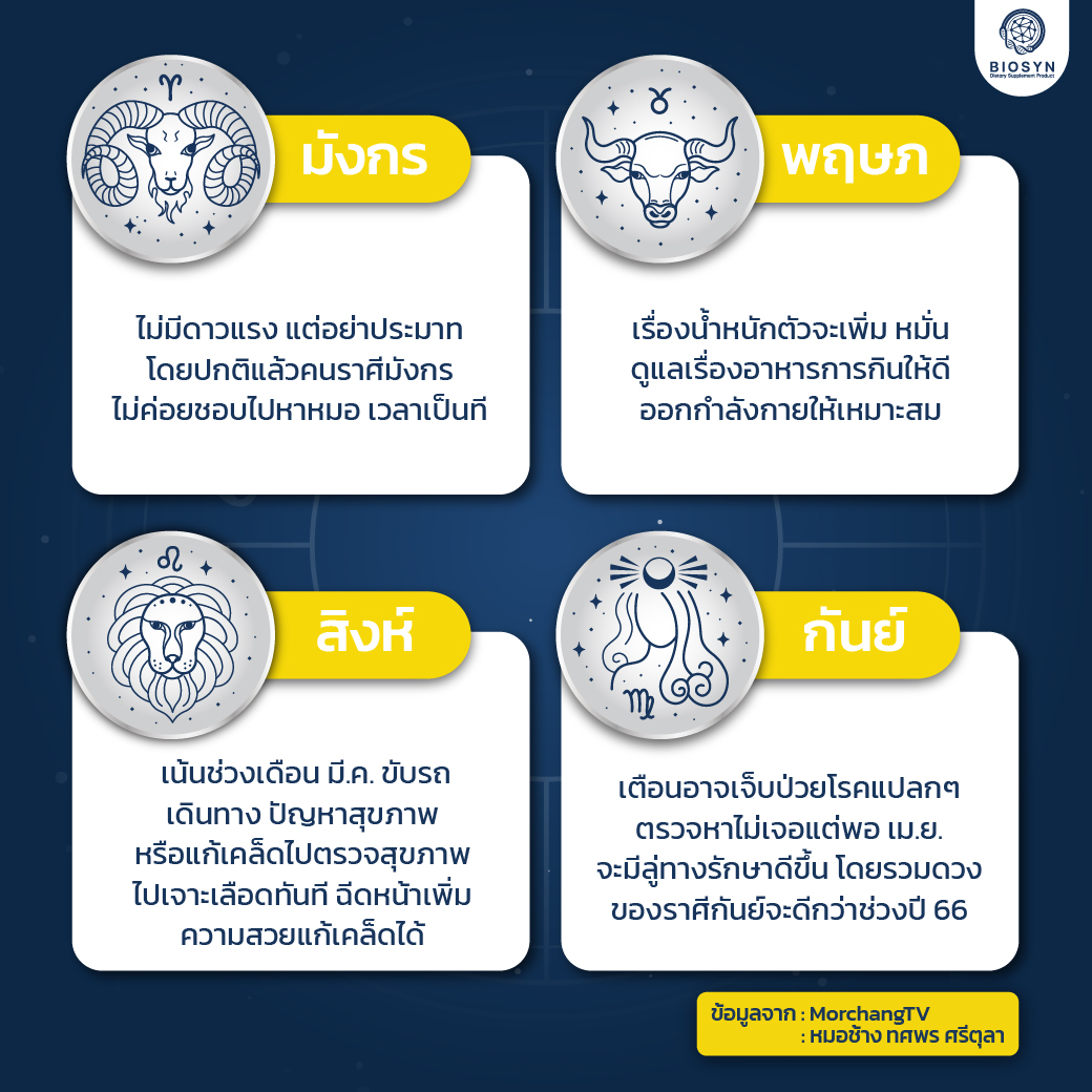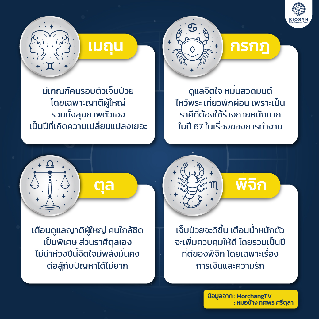 สายมู สายดูดวงห้ามพลาด (ความเชื่อส่วนบุคคล) จะสิ้นปีเเล้ว BioSyn Thailand พามาดูดวงปี 67 กับคำทำนายจากช่อง MorchangTv ทั้งเรื่องการงาน การเงิน ความรัก หรือเเม้เเต่สุขภาพ เพราะสุขภาพของเราเป็นสิ่งสำคัญ ควรระมัดระวังเเละดูเเลสุขภาพให้ดีอยู่เสมอ