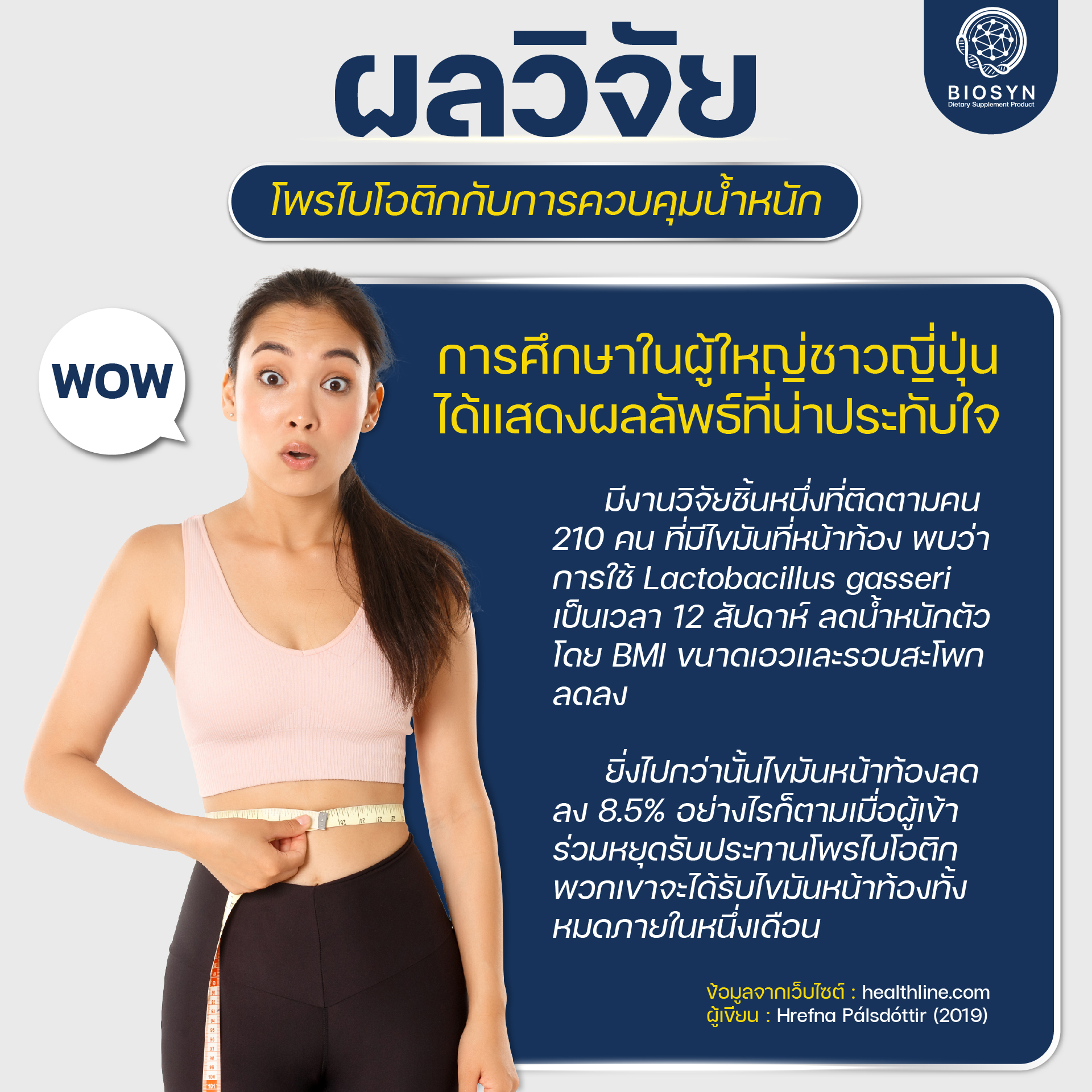 เริ่มต้นเป็นสาย Healthy ด้วยแนวทางปรับสมดุลสุขภาพช่องท้องและลำไส้ ซึ่งใน BioSyn ซินไบโอติกมีโพรไบโอติกจุลินทรีย์ดี 15 สายพันธ์ุ + พรีไบโอติก หนึ่งในนั้นมีสายพันธ์ุที่ช่วยเรื่องของการลดน้ำหนัก Lactobacillus Gasseri, Lactobacillus reuteri, Lactobacillus sakei ส่งผลต่อการเผาผลาญและการควบคุมน้ำหนัก