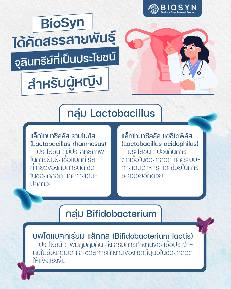 ซึ่งในผลิตภัณฑ์เสริมอาหาร BioSyn มีพรีไบโอติก + โพรไบโอติก ทั้งหมด 15 สายพันธุ์ และได้คัดสรรสายพันธุ์จุลินทรีย์ที่เป็นประโยชน์สำหรับผู้หญิง ดังนี้